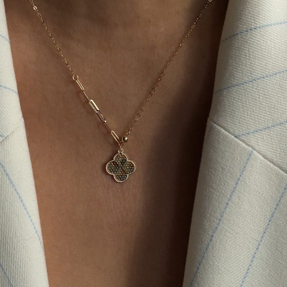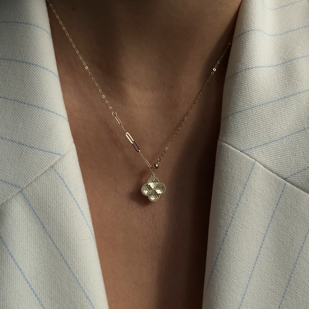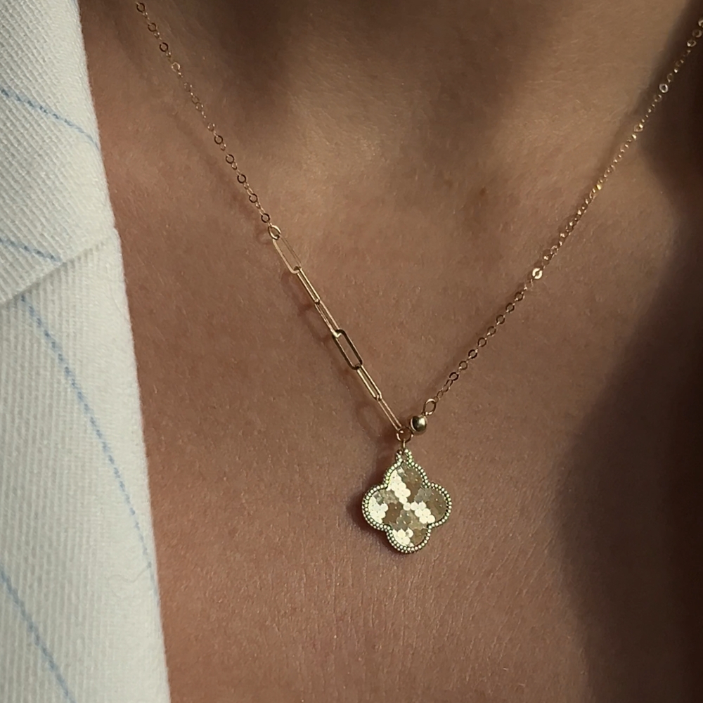 Złoty naszyjnik koniczynka koniczyna diamentowana mieniąca się cała złota błyszcząca złoto 585 14k dla niej koniczyna splot spinaczowy spinacze cekinki efekt cekinów disco efekt brokatu